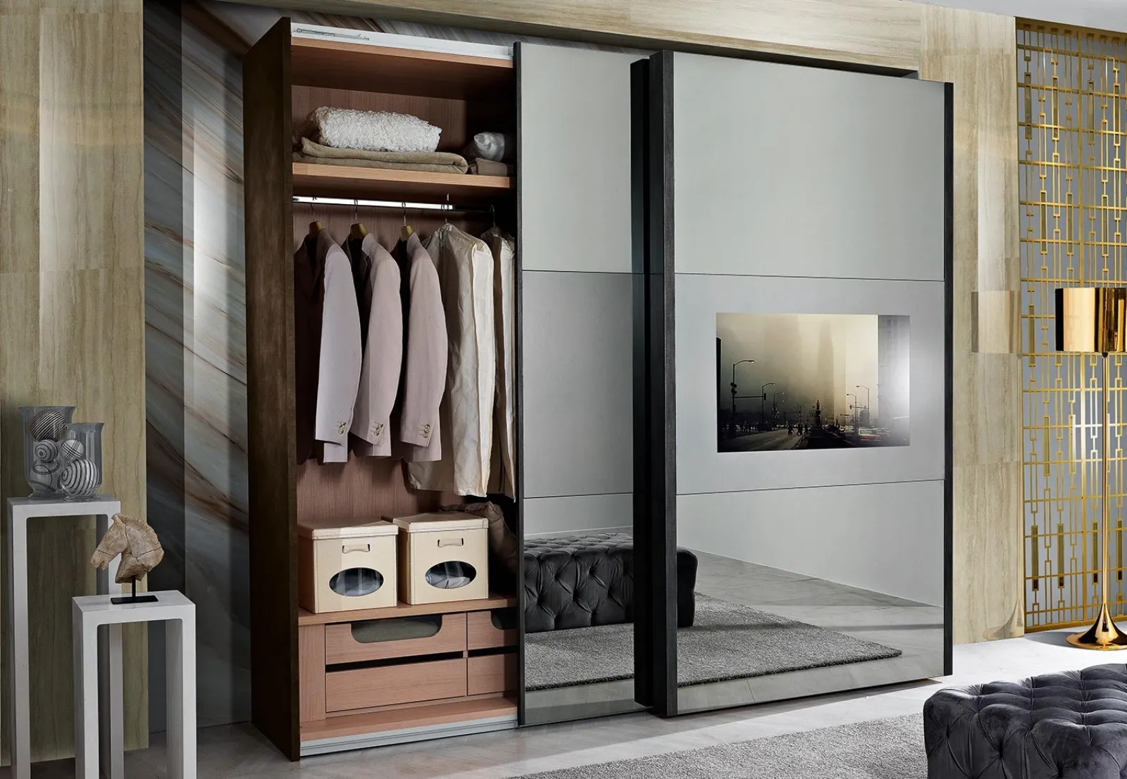 Armadio con ante a specchio Incanto di Mobil Più: compila il form per informazioni e preventivi e progetta la tua casa come l'hai sempre sognata. Per completare il concept d'arredo in una zona notte pratica e sofisticata, abbiamo scelto per te le più esclusive e accattivanti soluzioni Mobil Piu, diverse per stile, grandezza, materiale e elementi accessori. Contattaci e ottieni informazioni su una ricca gamma di Arredamento Casa per ammobiliare la camera da letto potendo usufruire di mobili contenitori in vetro di alto contenuto estetico. Nella nostra linea di Armadi a muro moderni con ante scorrevoli troverai anche il modello presente in foto, ideale per chi cerca funzionalità e stile.