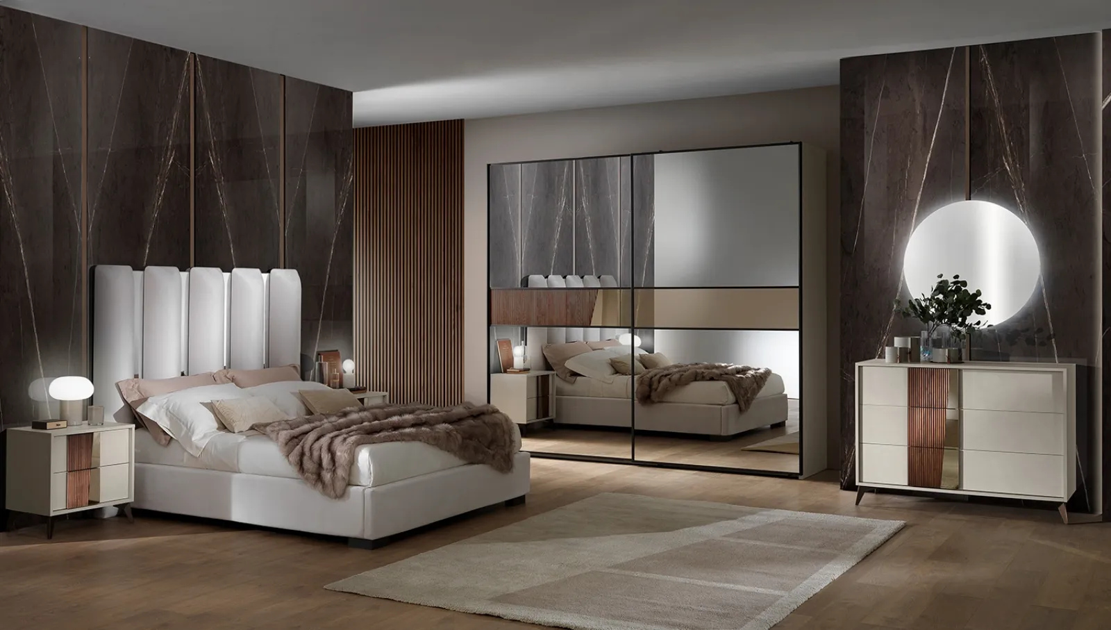 Materiali pregiati e lavorazioni eccellenti per il Gruppo Notte Grazia effetto Malta Bianca di Mobil Più in in laccato opaco, disponibile in negozio insieme alle altre varie proposte della firma, per fare della zona notte un luogo che ricalchi la tua personalità. Ti domandi in che modo abbinare letti, armadi e comò? Con il modello di Mobil Piu visibile in foto avrai un arredo adatto per un luogo dai richiami moderni.